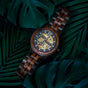 Davenport, eine Holzuhr für den Mann. Diese Herrenuhr aus Holz kombiniert helle und warme Brauntöne mit einem goldenen Uhrwerk. Die goldenen Zahnräder der Uhr werden von dunkel brauner Eiche umschlossen.