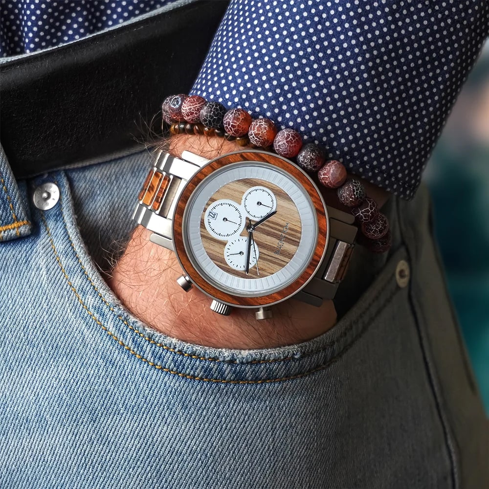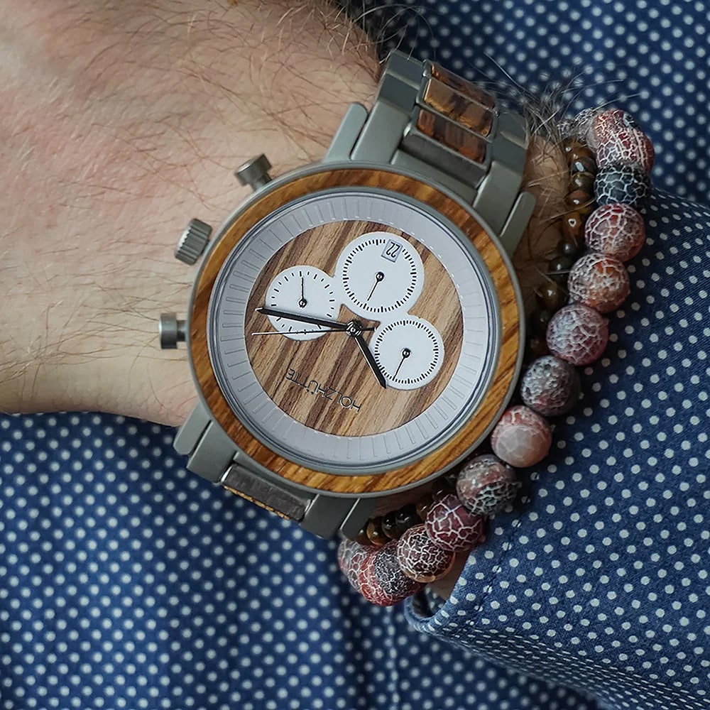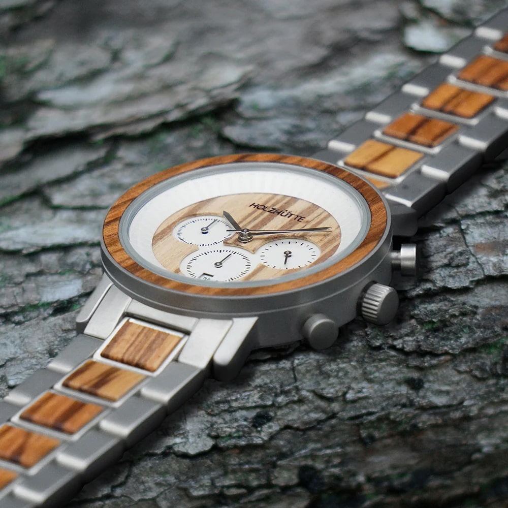 Mit der Barcelona folgst du dem Trend der Neuzeit. Wärmende Hölzer werden eingebettet im silberfarbenen Edelstahl. Die konzeptionelle Kombination von Wärme und Kälte endet in einem makellosen Design. Das hochwertige und außergewöhnliche Ziffernblatt passt nicht nur zu Hemden sondern auch zu einem lockeren Stil.
